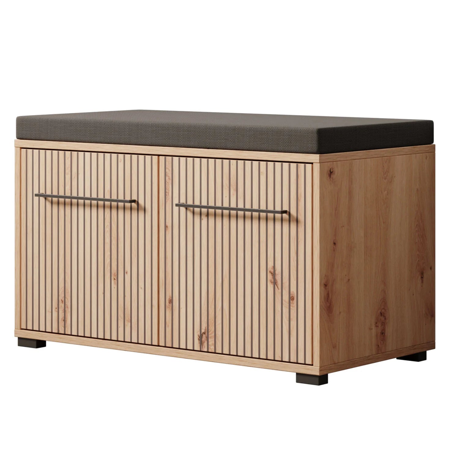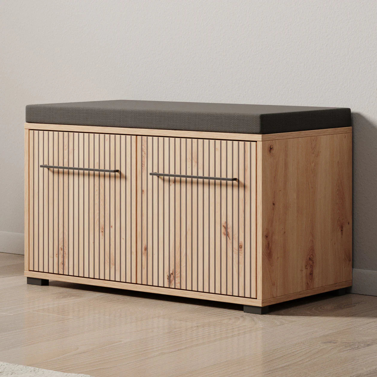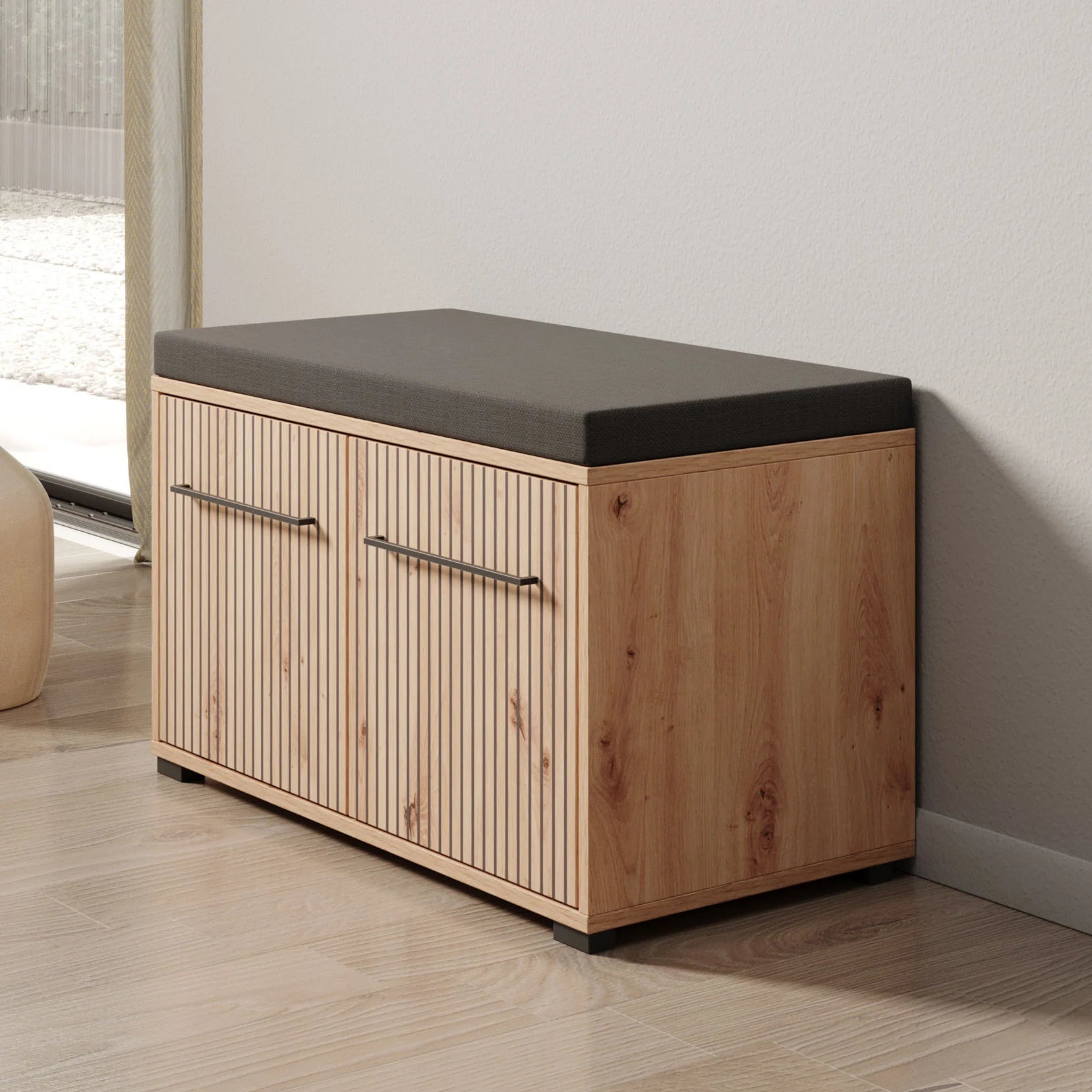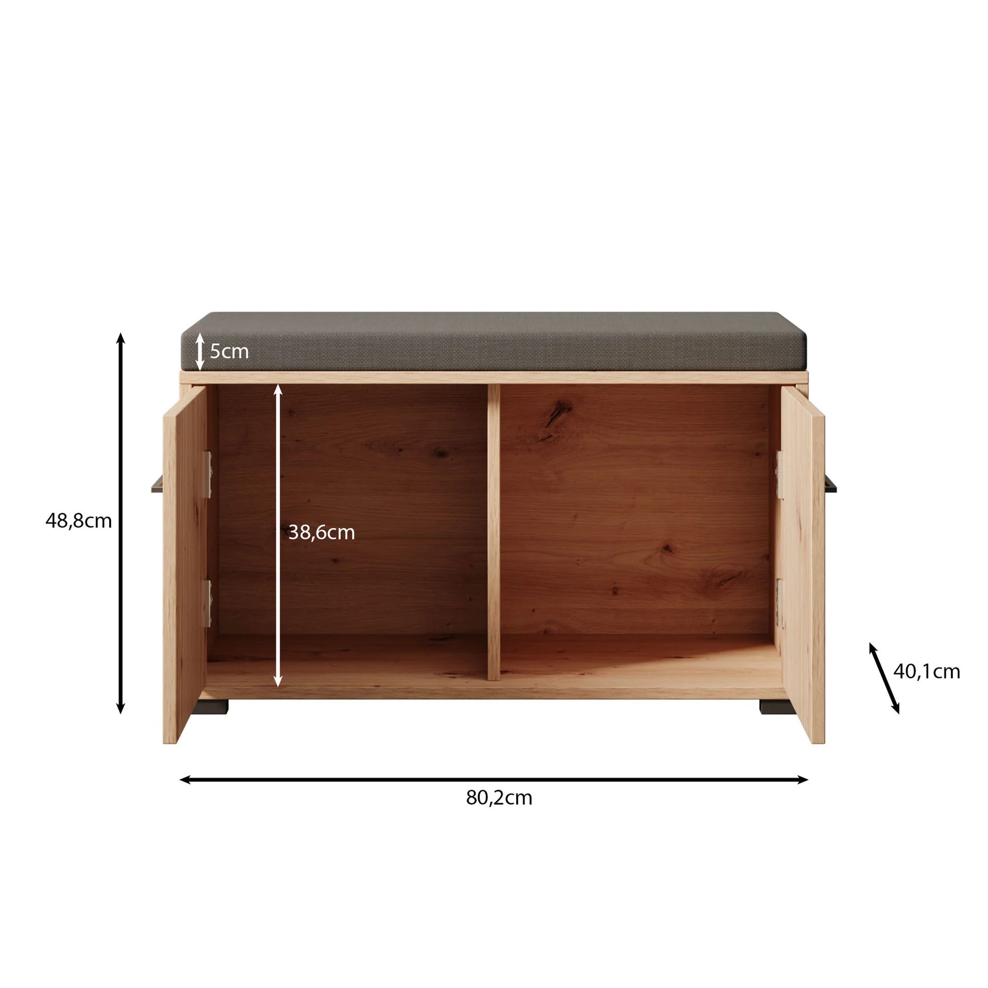 Schoenenkast Lobos is een modern meubel in de kleur eiken, welke is geschikt voor het opbergen van je schoenen. Het kastje is voorzien van 2 deuren die te openen zijn met een zwarte handgreep. Hierachter zitten in totaal 2 opbergvakken. Het meubel heeft een kussentje op het bovenblad.