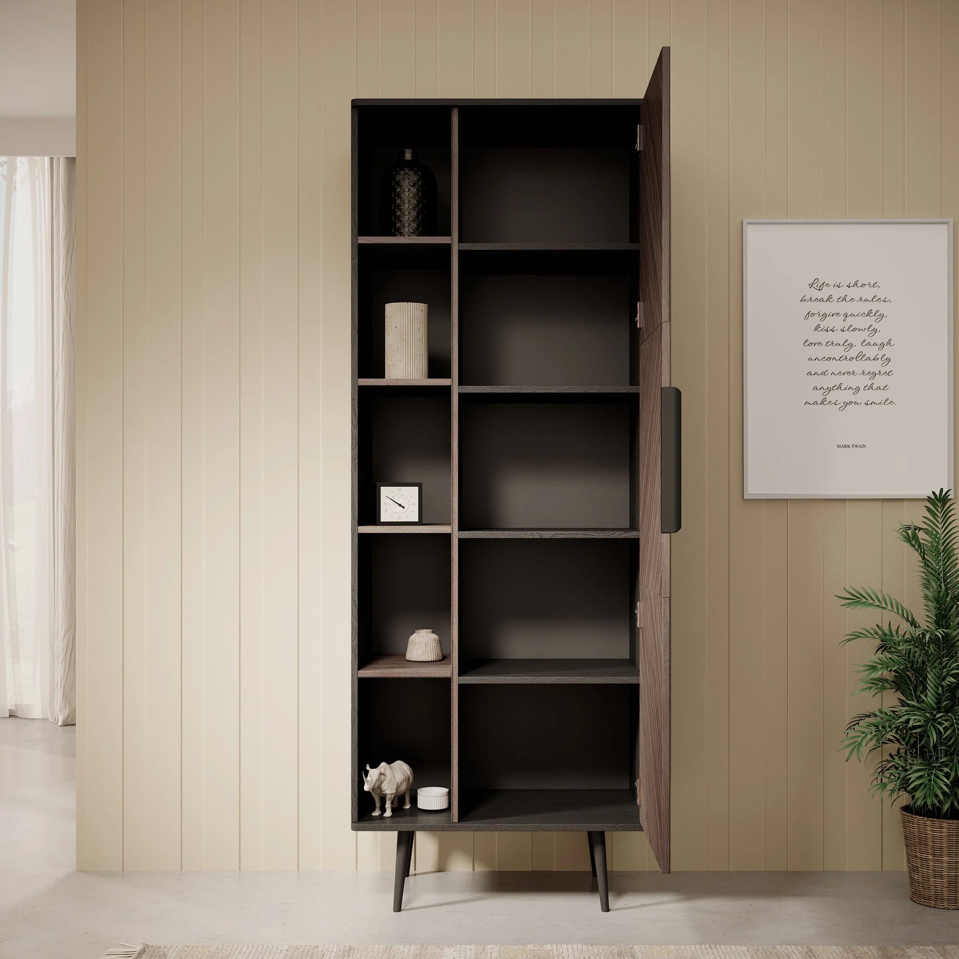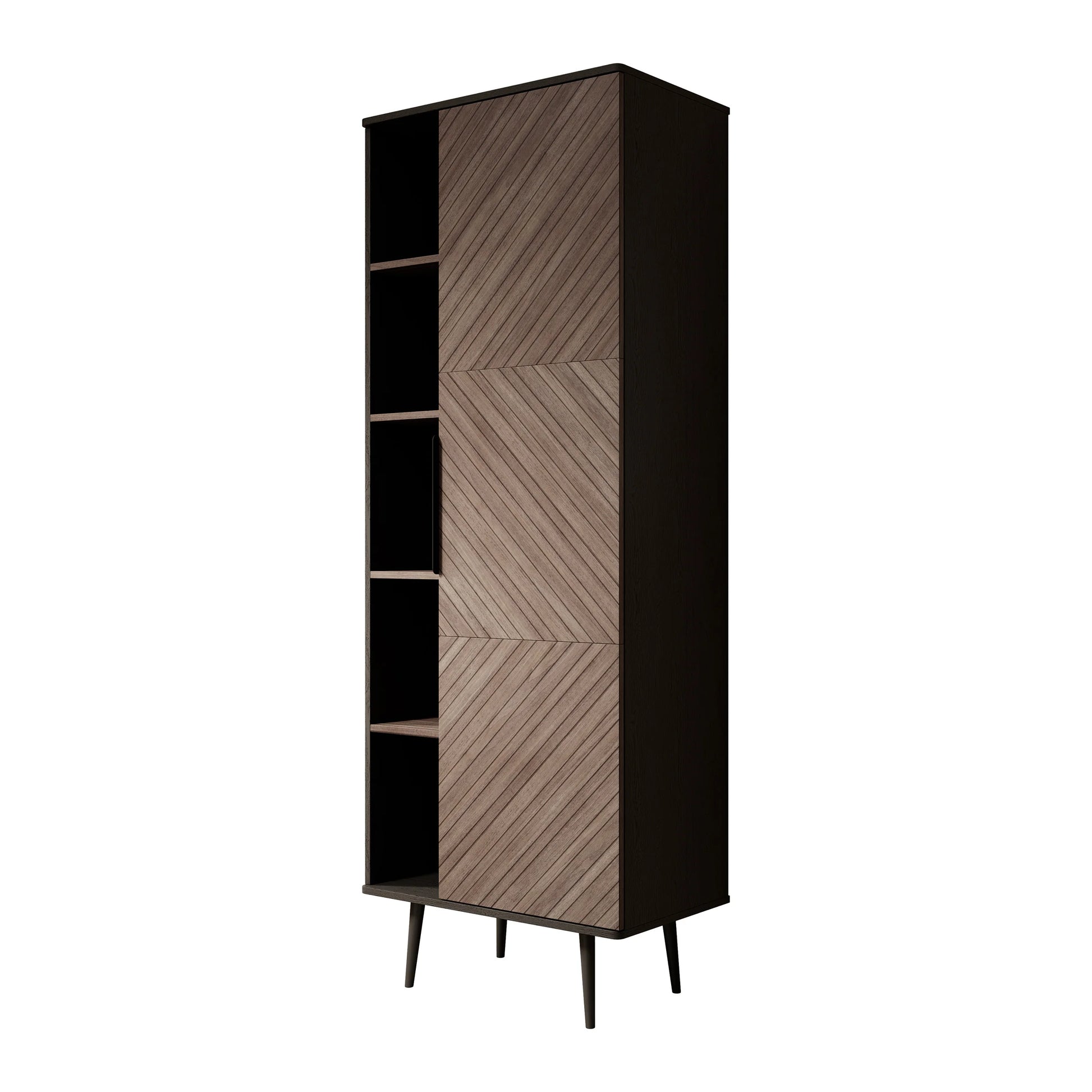 De boekenkast heeft 1 deur die opent met een zwarte handgreep waarachter 5 opbergvakken zitten. Naast de deur bevinden zich nog eens 5 open vakken.