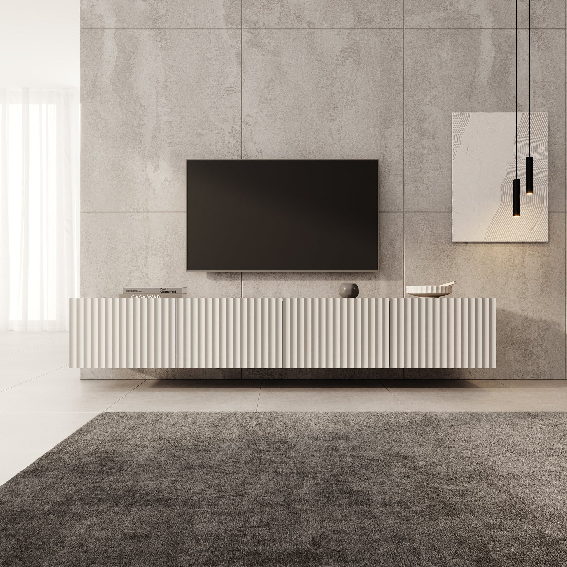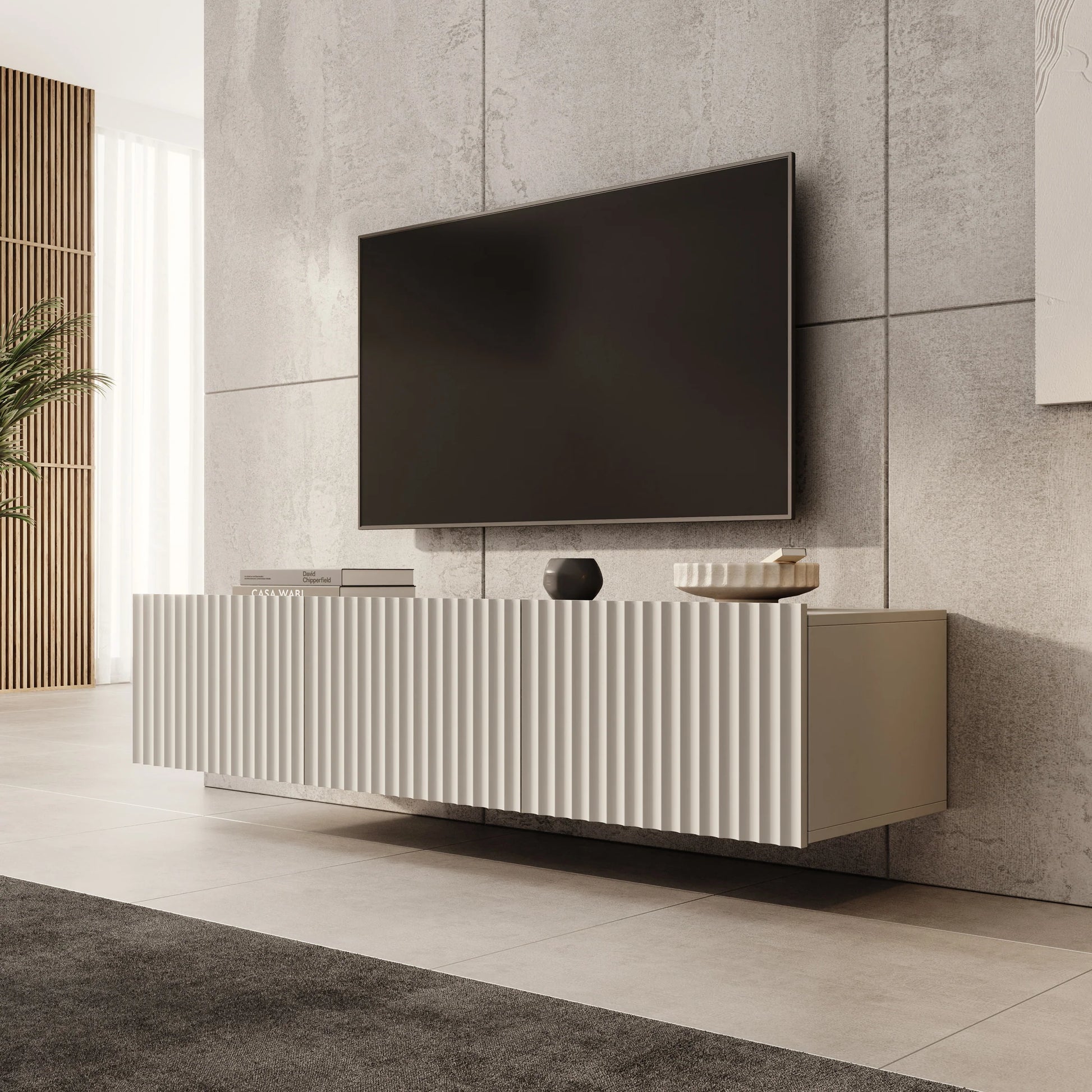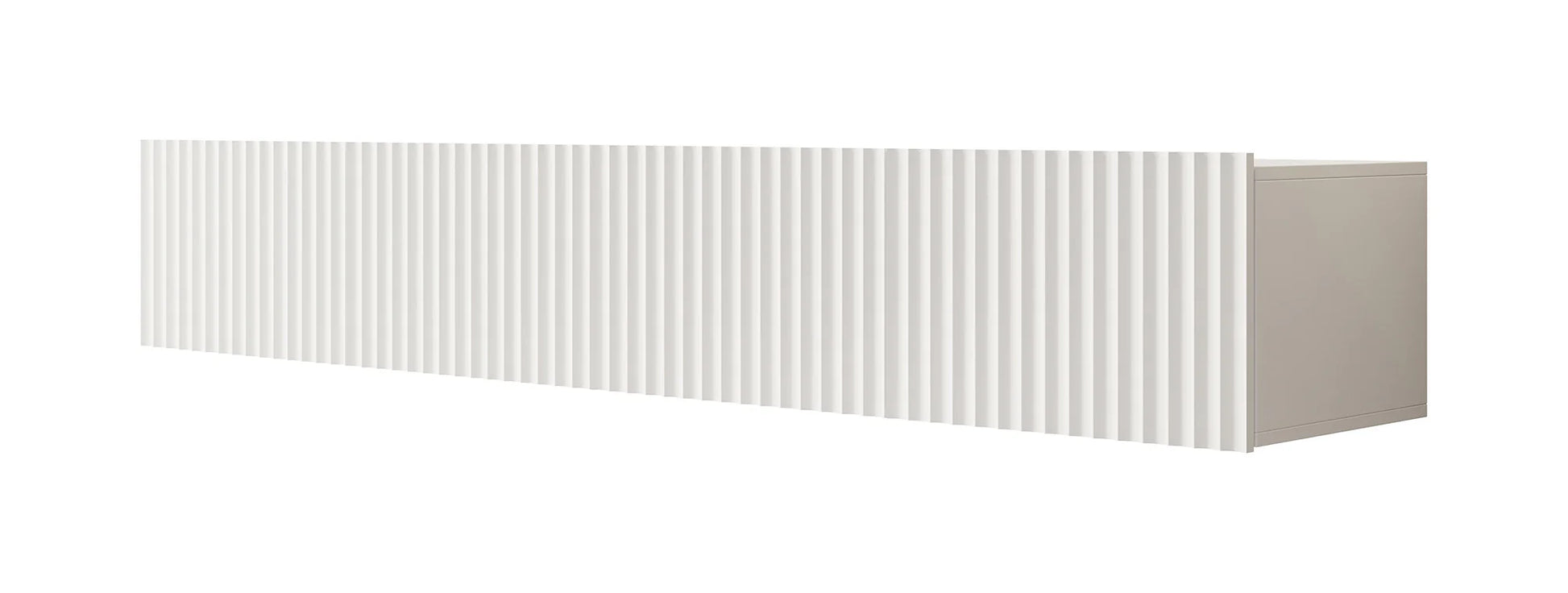 TV-meubel Pepinos is een hangend model in mat zwarte/witte/beige/naturel kleur met een voorzijde in lamelstructuur. Het meubel is uitgerust met vier kleppen die aan de bovenzijde openen. Achter de kleppen bevinden zich twee ruime opbergvakken voor apparatuur en accessoires. Het meubel heeft een draagvermogen van 20 kg.