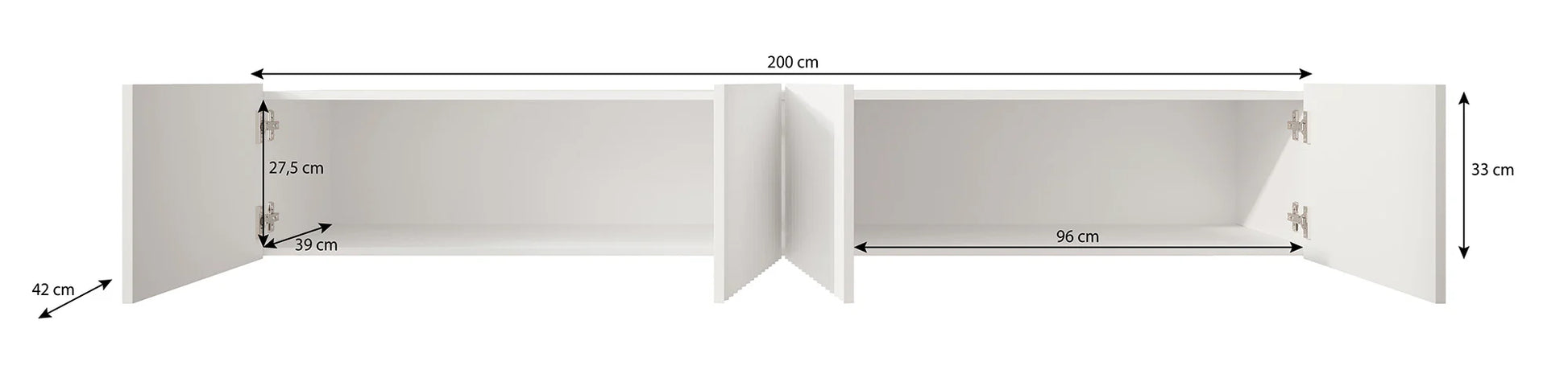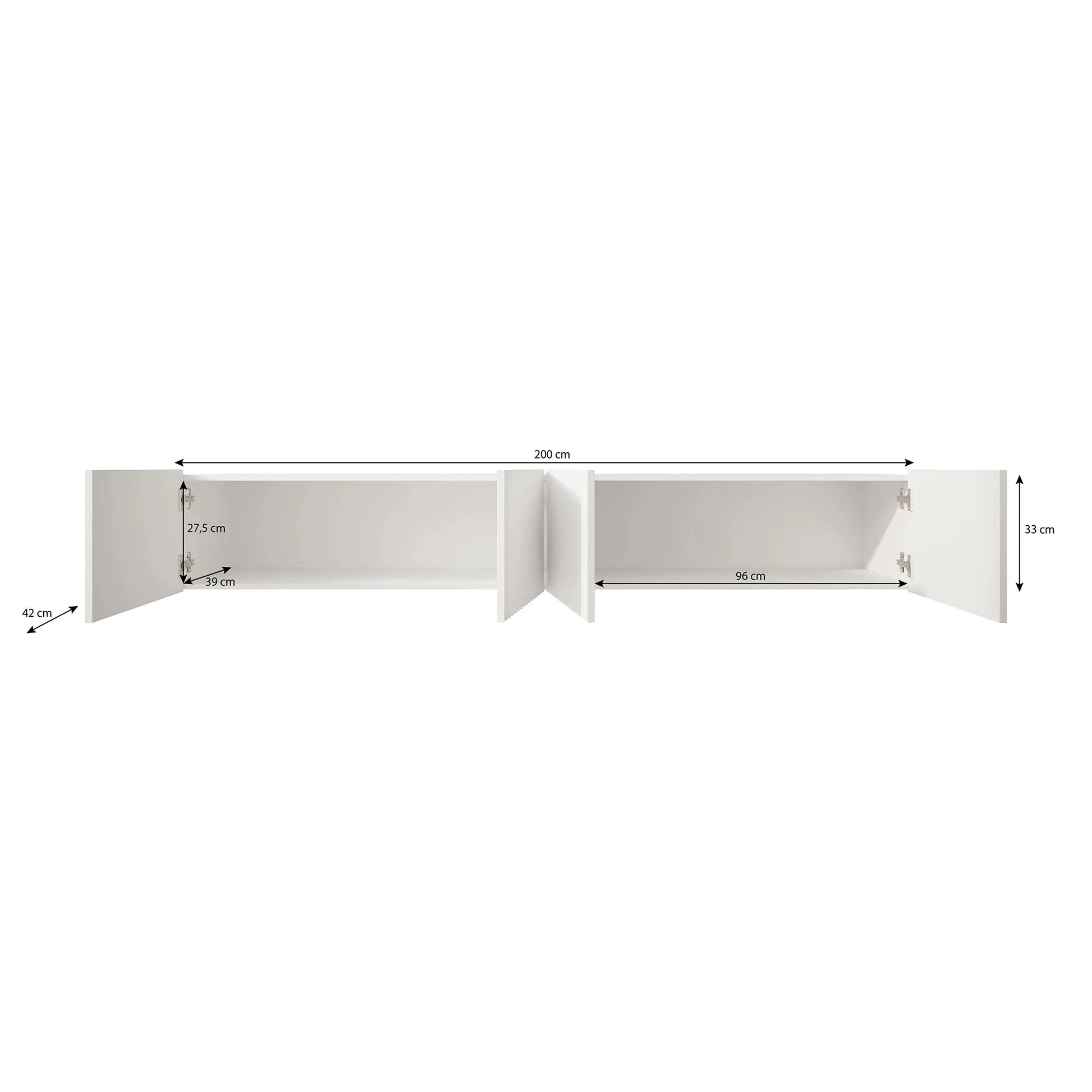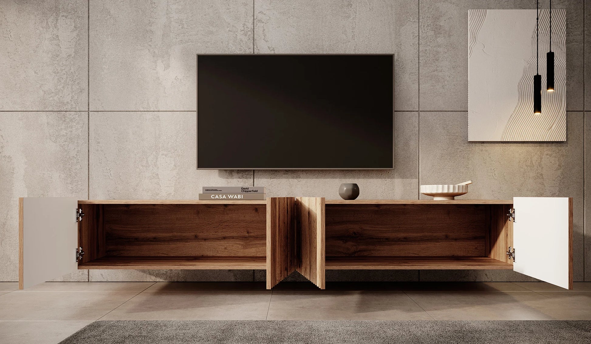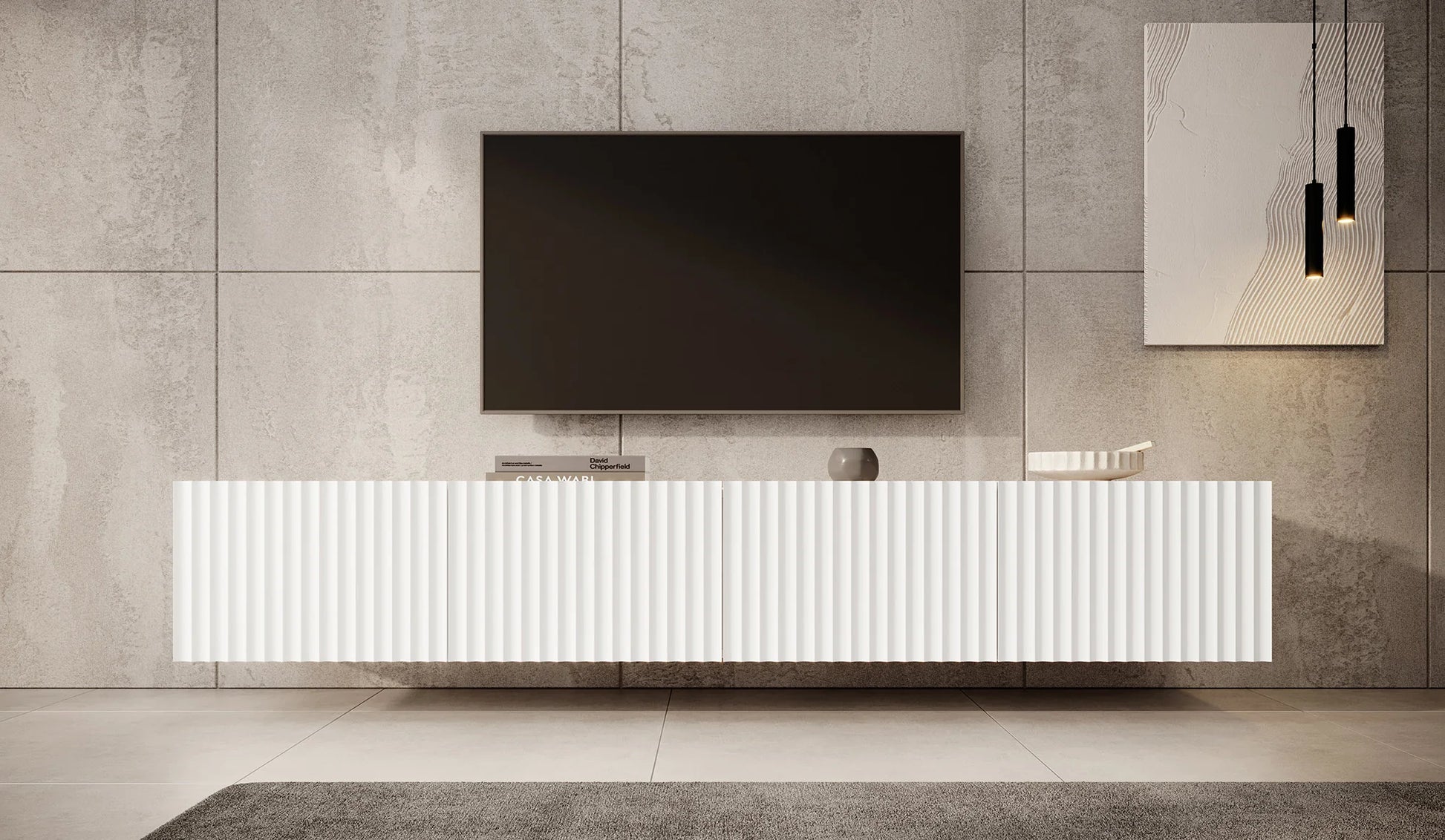 TV-meubel Pepinos is een hangend model in mat zwarte/witte/beige/naturel kleur met een voorzijde in lamelstructuur. Het meubel is uitgerust met vier kleppen die aan de bovenzijde openen. Achter de kleppen bevinden zich twee ruime opbergvakken voor apparatuur en accessoires. Het meubel heeft een draagvermogen van 20 kg.