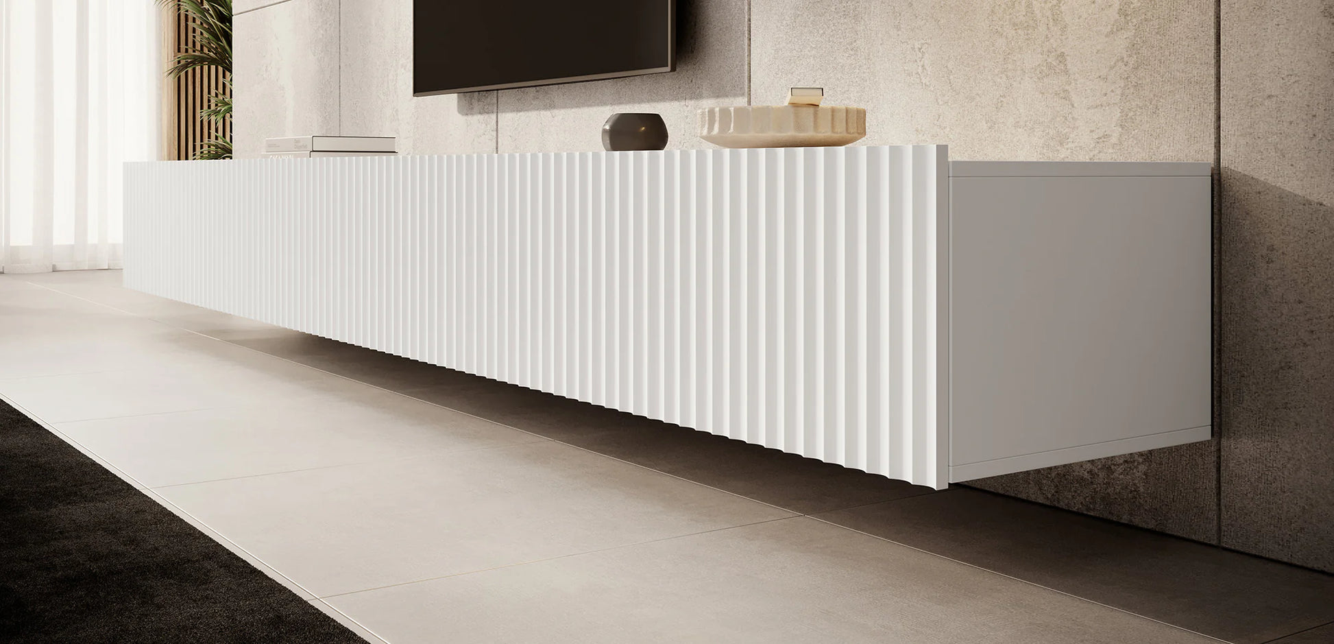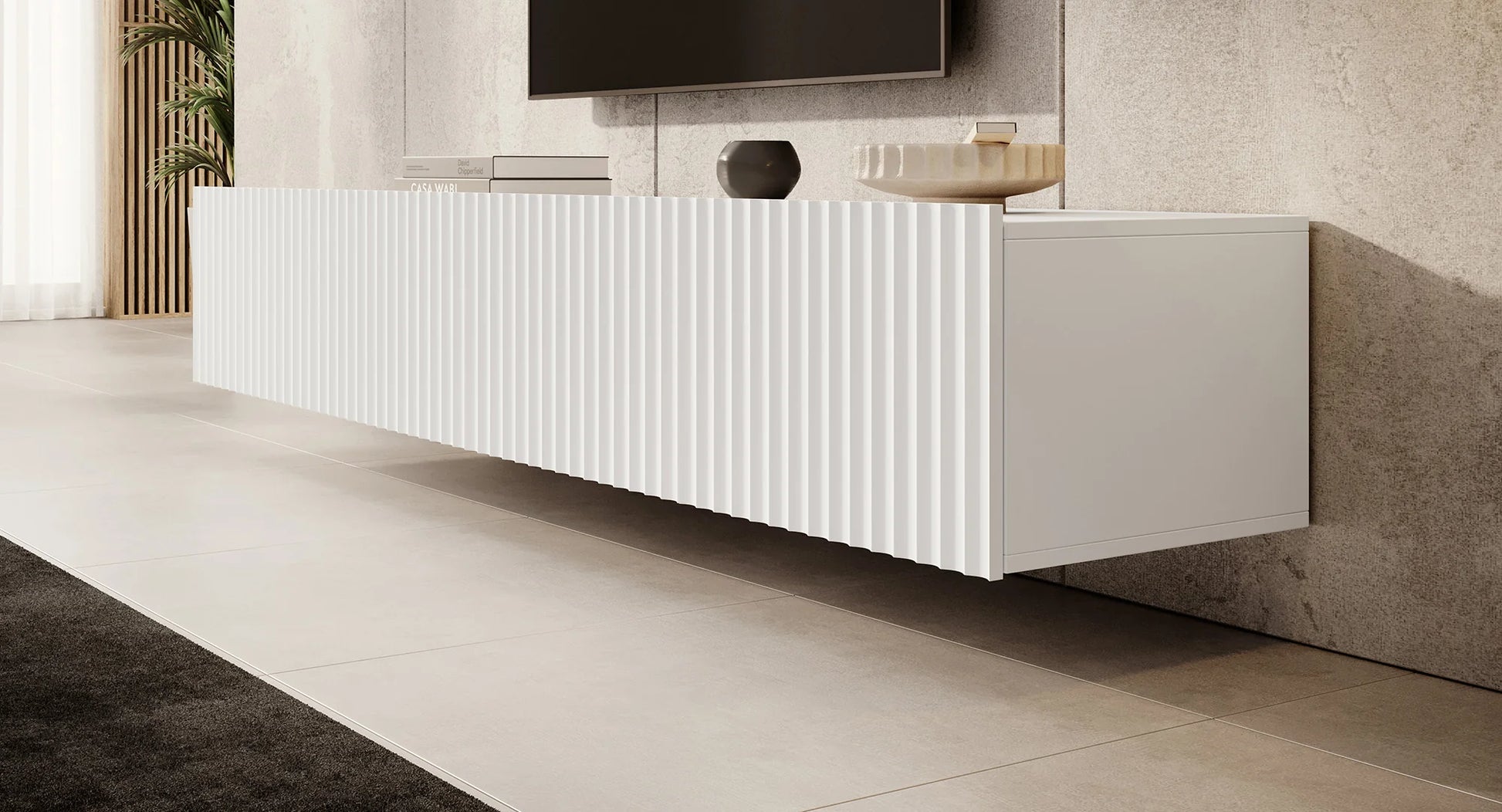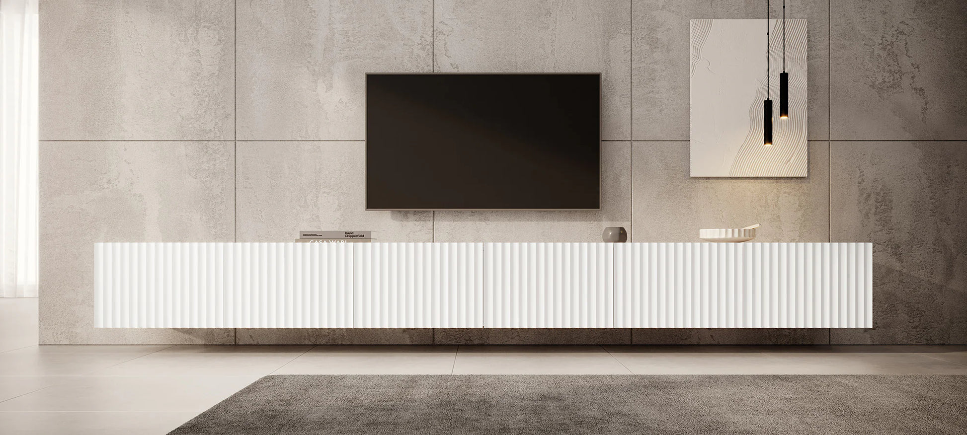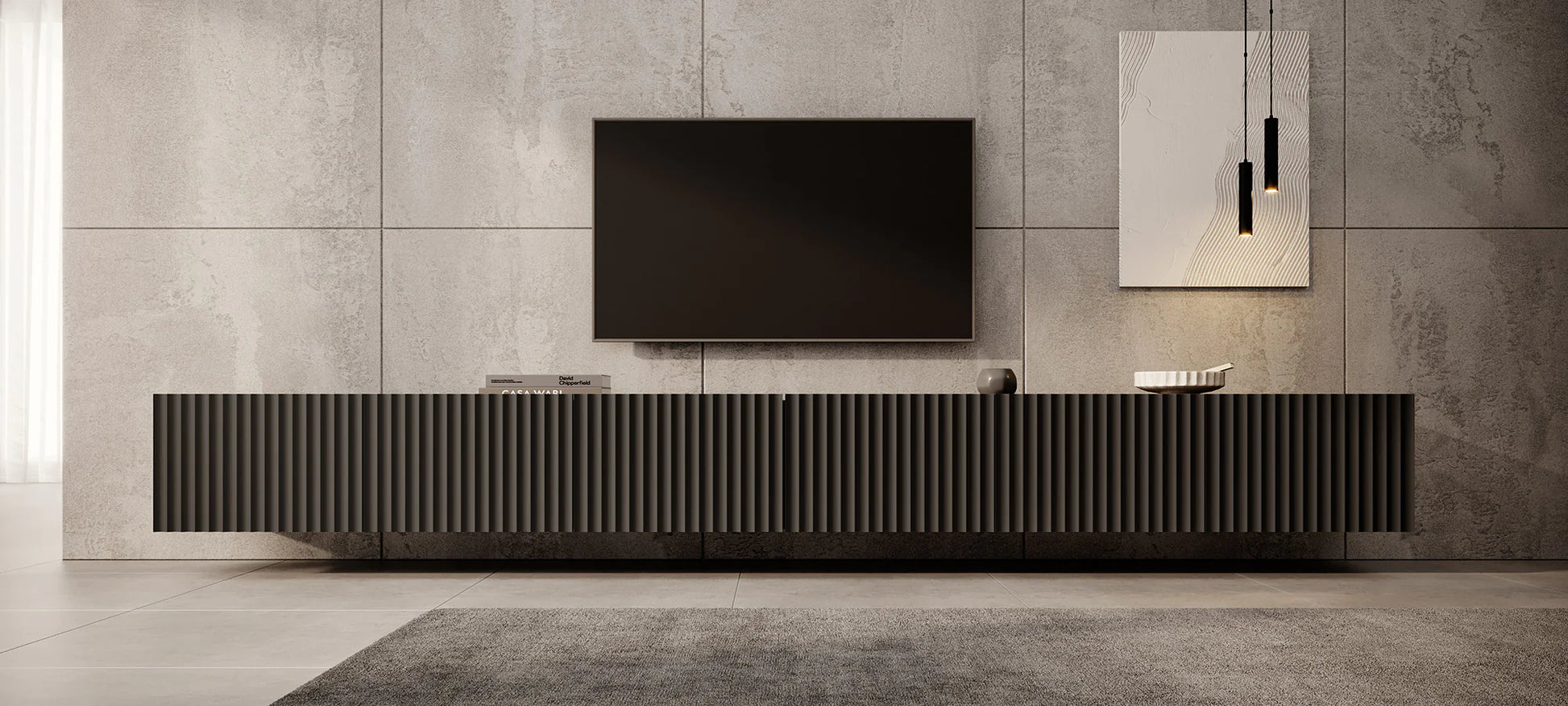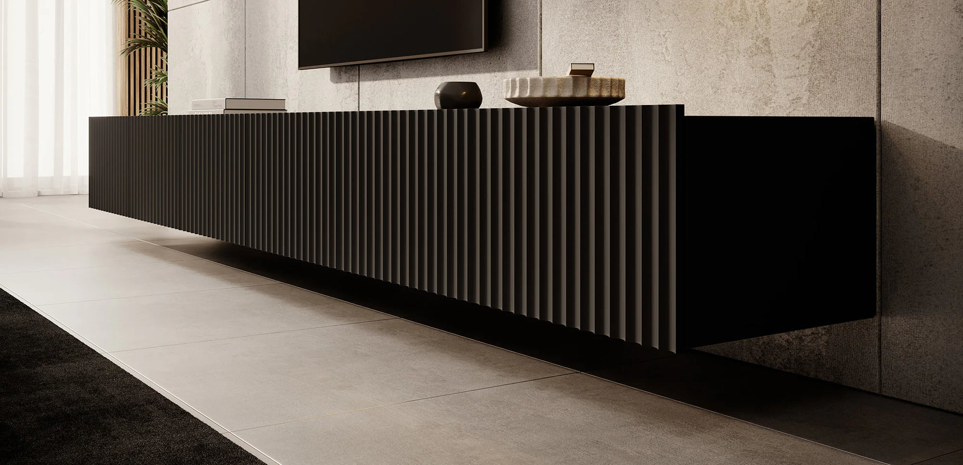 Door de zwevende montage blijft de vloer vrij en houdt het geheel een strakke, overzichtelijke uitstraling. De matte afwerking combineert goed met moderne en industriële interieurs. TV-meubel Pepinos is een praktische keuze wanneer je een brede, rustige tv-opstelling wilt creëren met voldoende gesloten bergruimte.