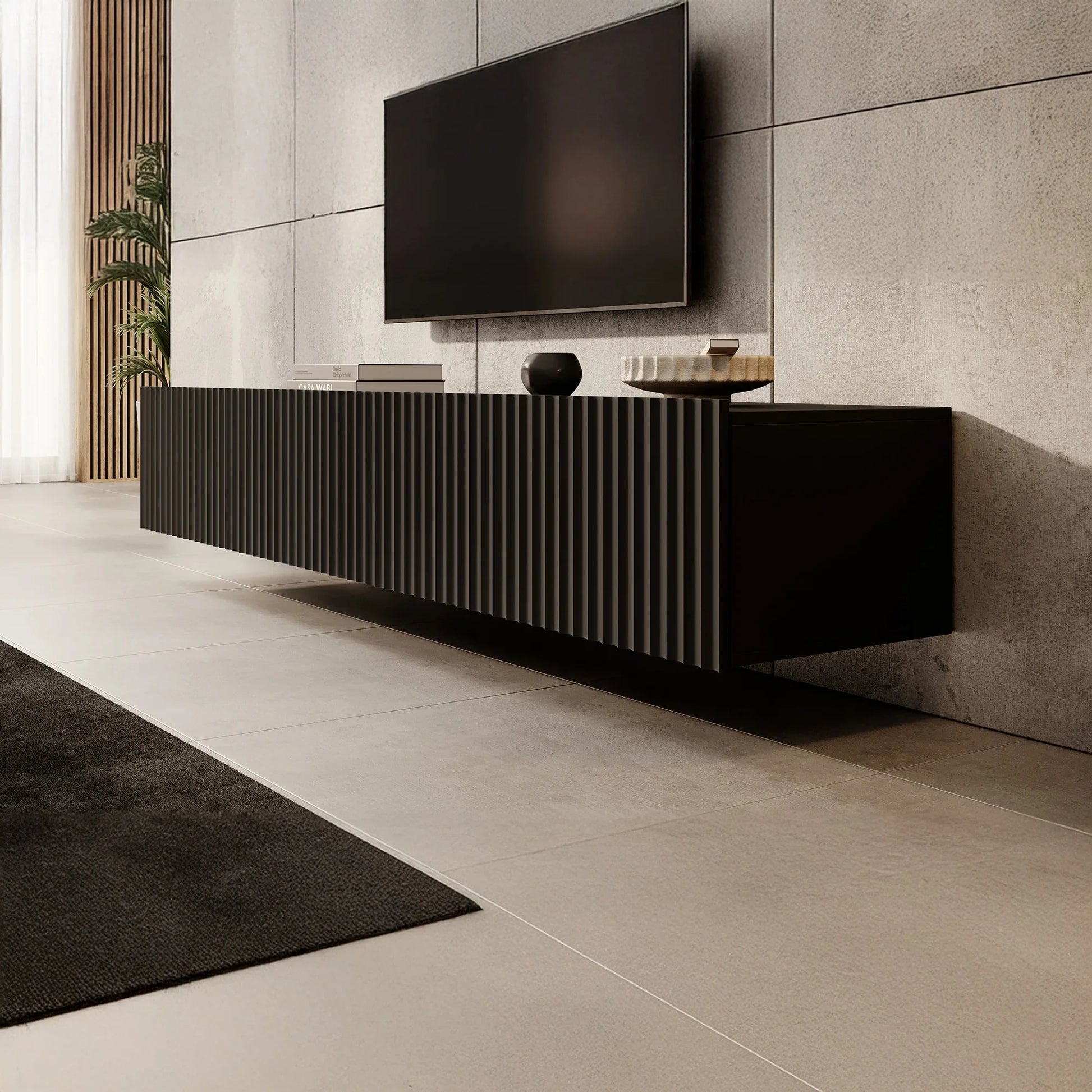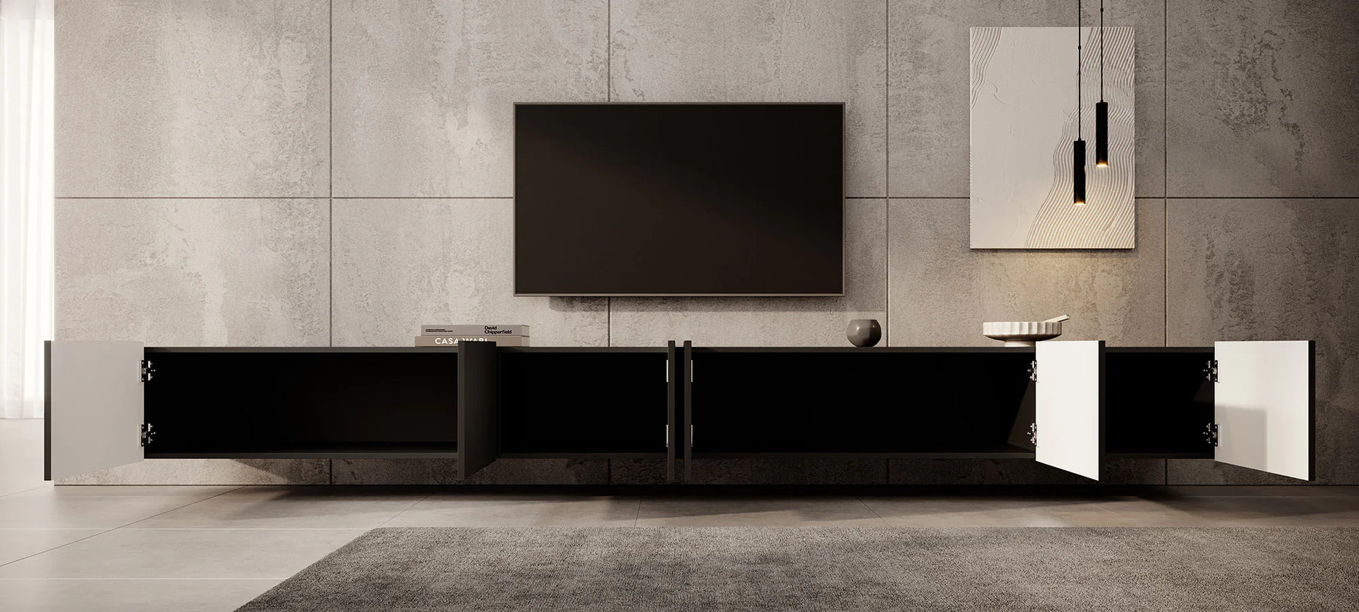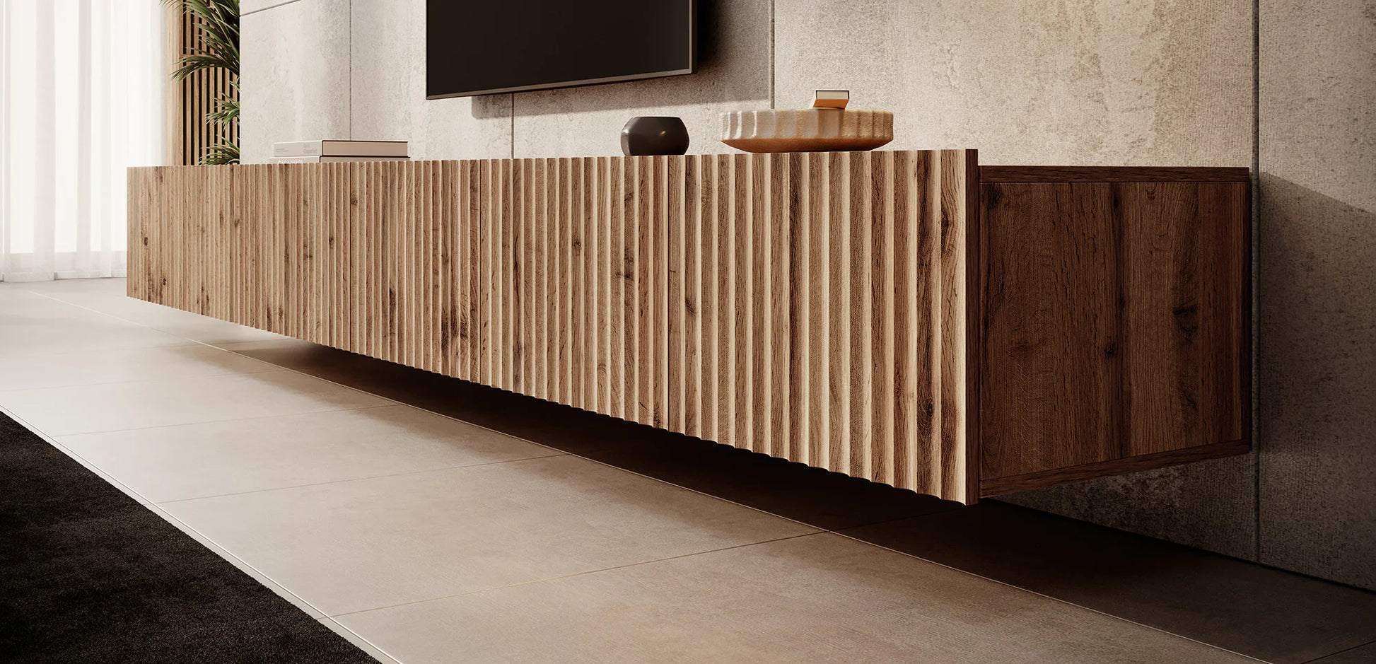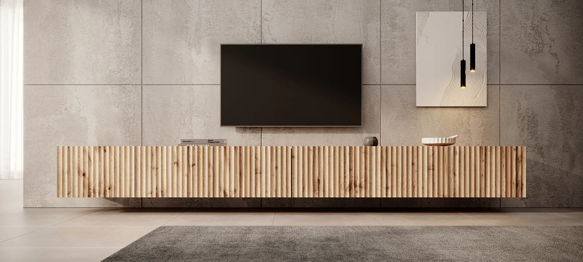 Door de zwevende montage blijft de vloer vrij en houdt het geheel een strakke, overzichtelijke uitstraling. De matte afwerking combineert goed met moderne en industriële interieurs. TV-meubel Pepinos is een praktische keuze wanneer je een brede, rustige tv-opstelling wilt creëren met voldoende gesloten bergruimte.
