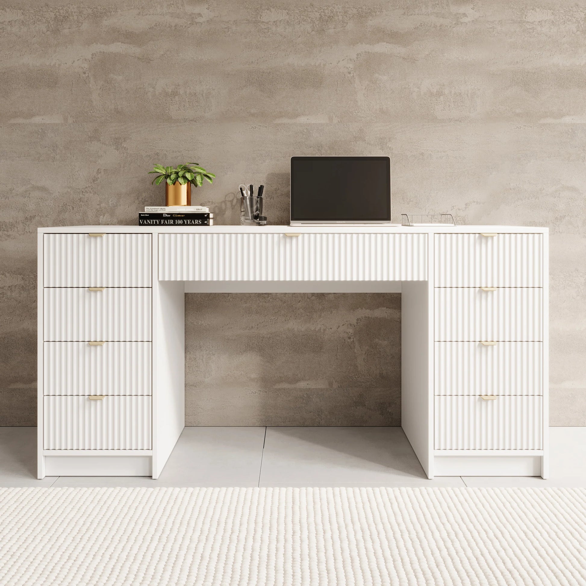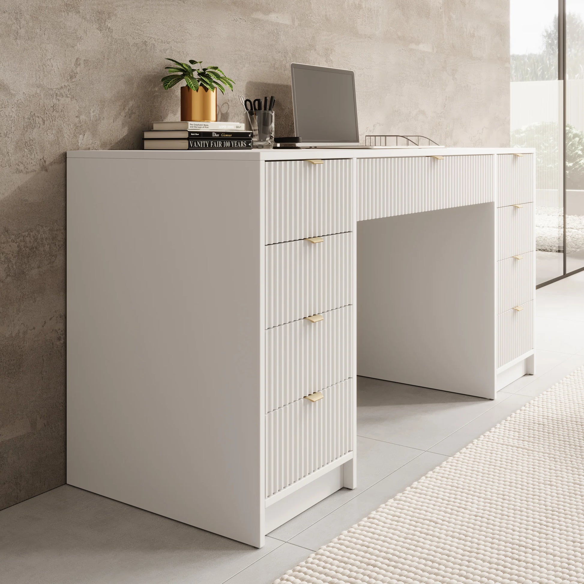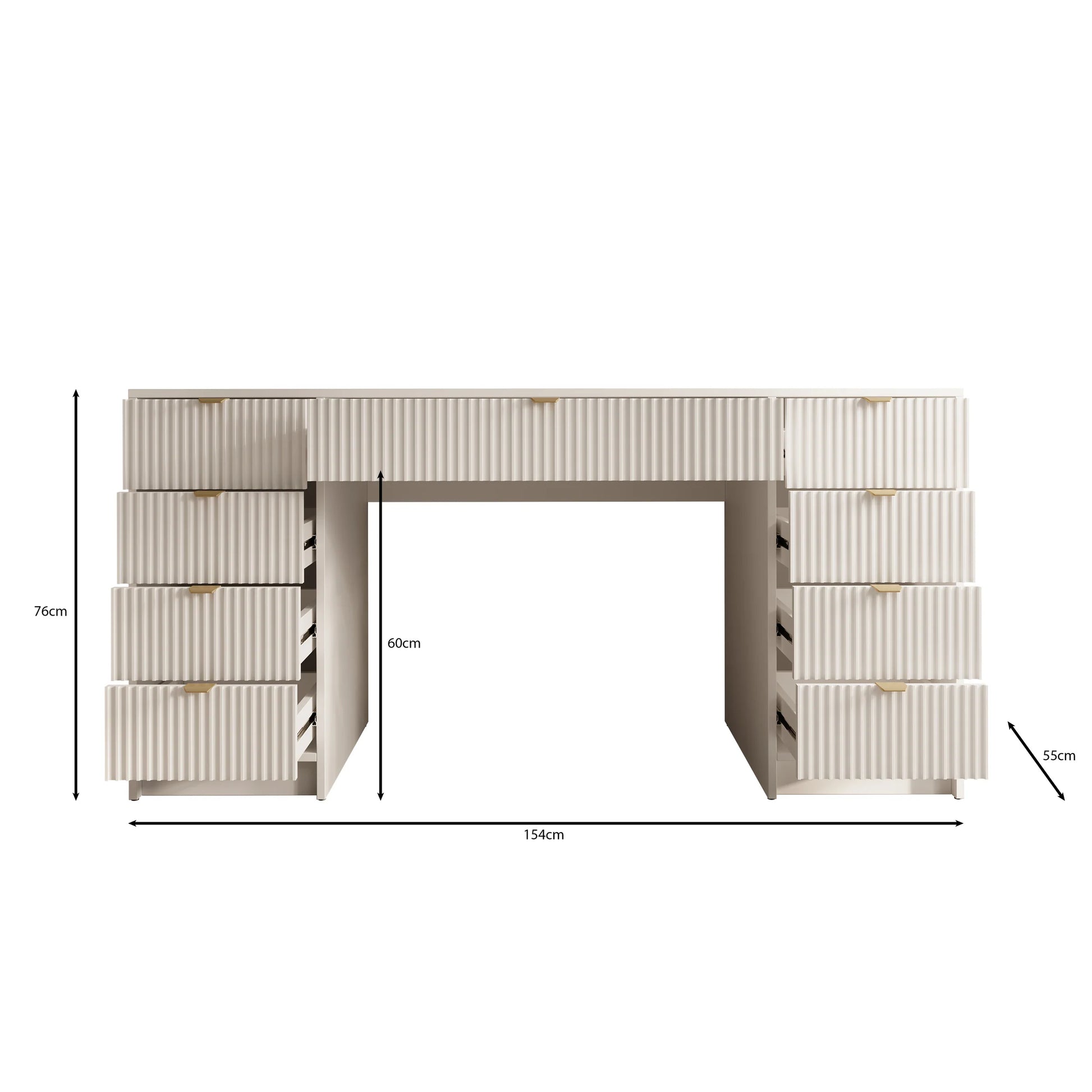 Met in totaal negen lades – 4 aan de ene kant, 4 aan de andere en één brede lade boven het zitgedeelte – is er volop ruimte om spullen overzichtelijk op te bergen in de 154 cm breed bureau.