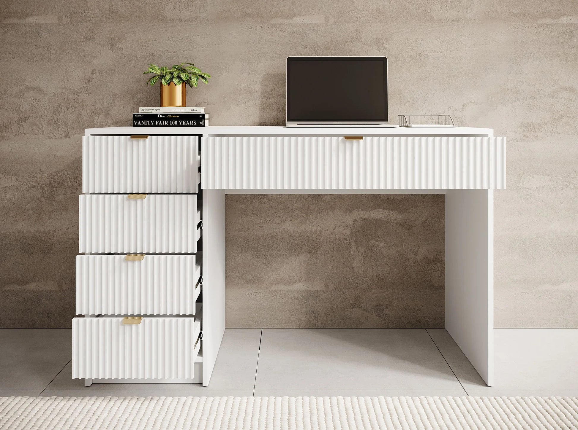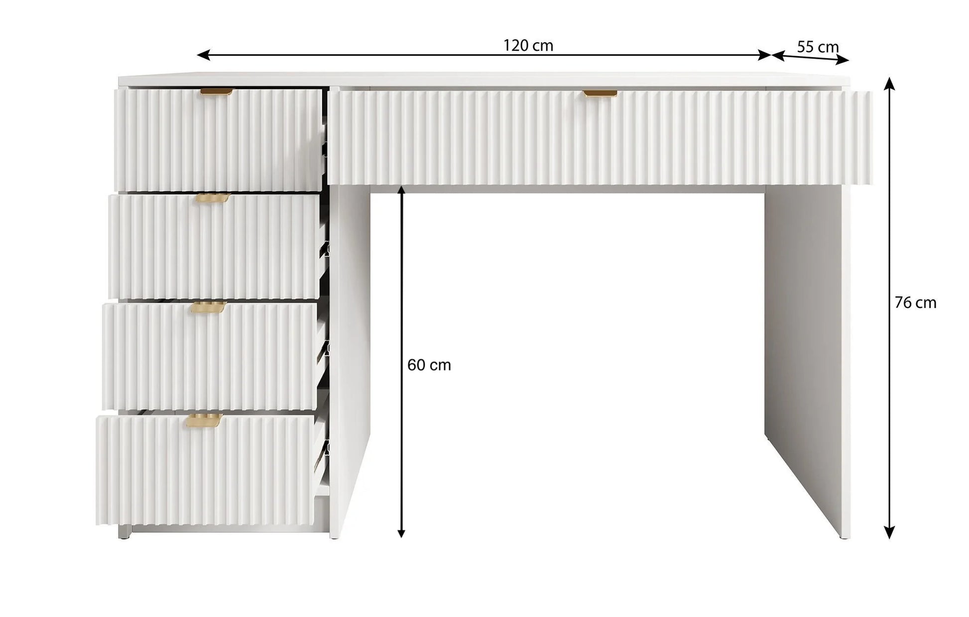Het 120 cm bureau is voorzien van 4 lades aan één zijde en een brede lade in het midden.