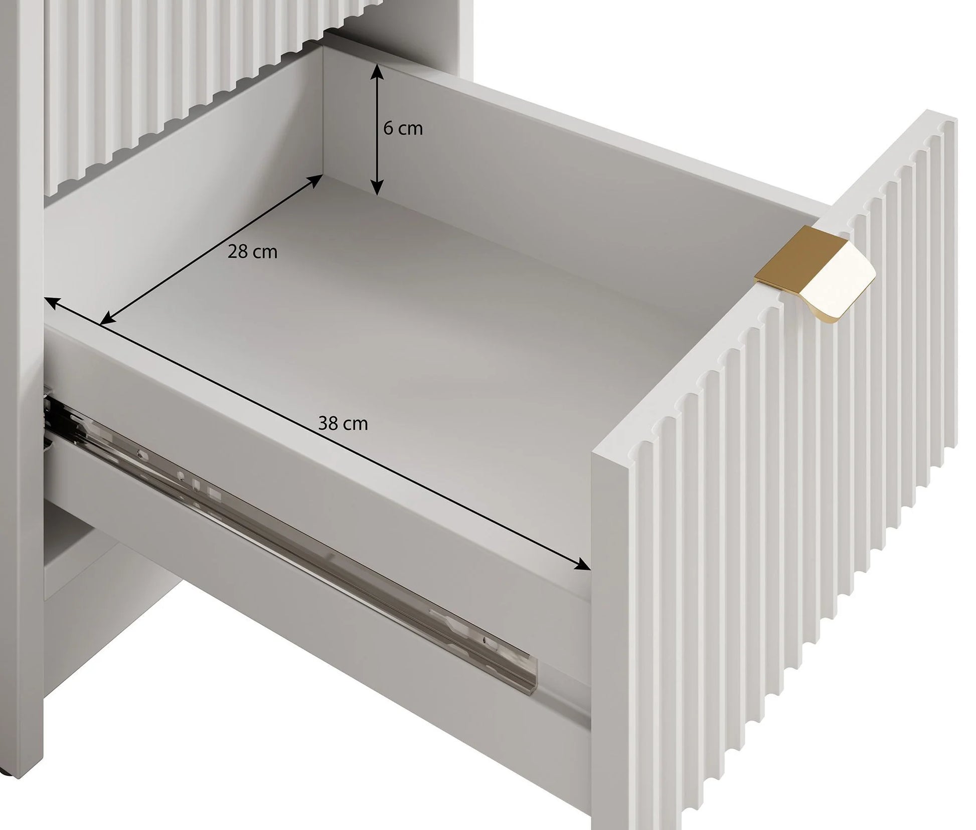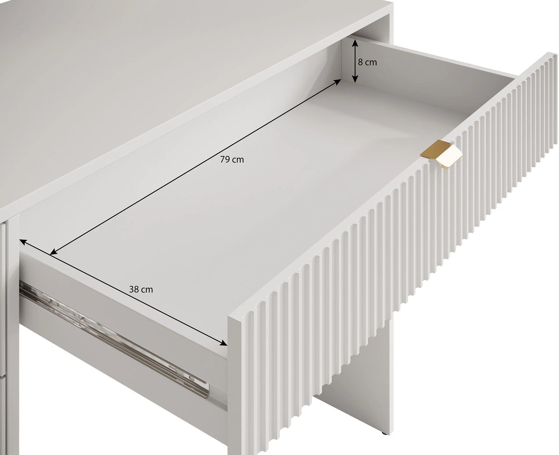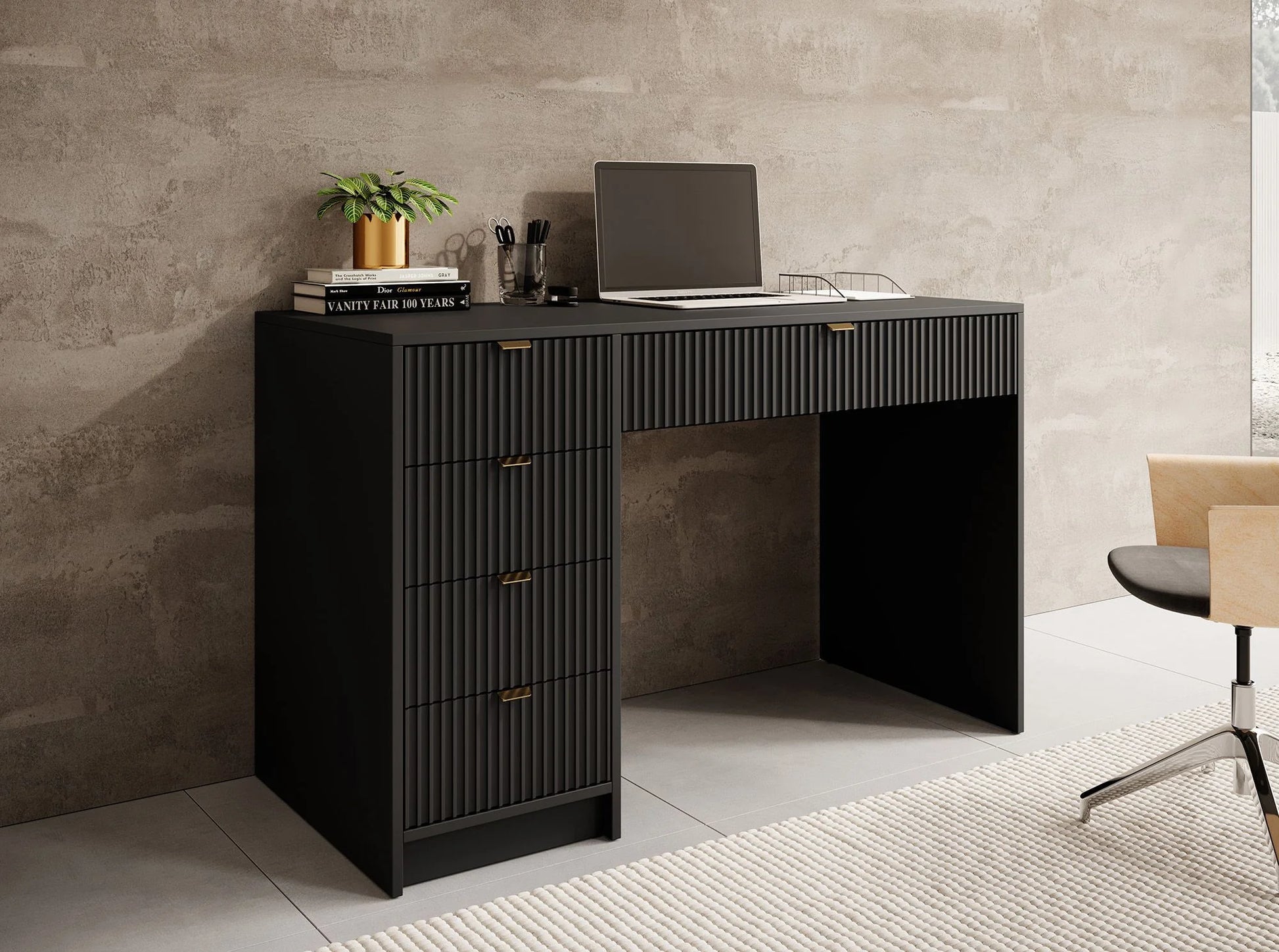 Bureau Tavares is een compacte oplossing voor wie stijl en functionaliteit wil combineren. Dit zwarte model heeft een modern ribfront met goudkleurige handgrepen, wat zorgt voor een hotelchique uitstraling.