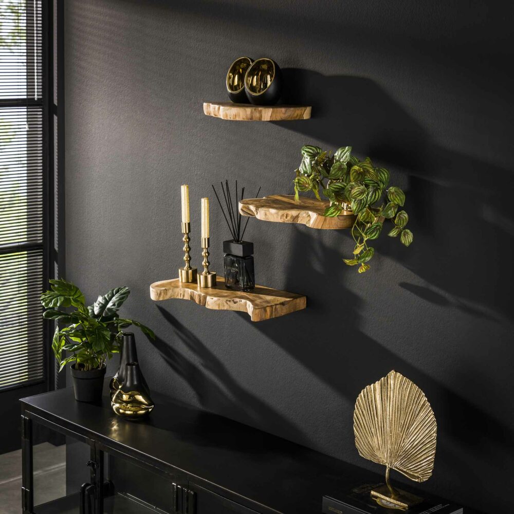 Dit elegante wandschap, genaamd 'Wandschap natural line set/3 / Massief gerecycled teakhout', voegt een stijlvolle en functionele toevoeging toe aan elke kamer.