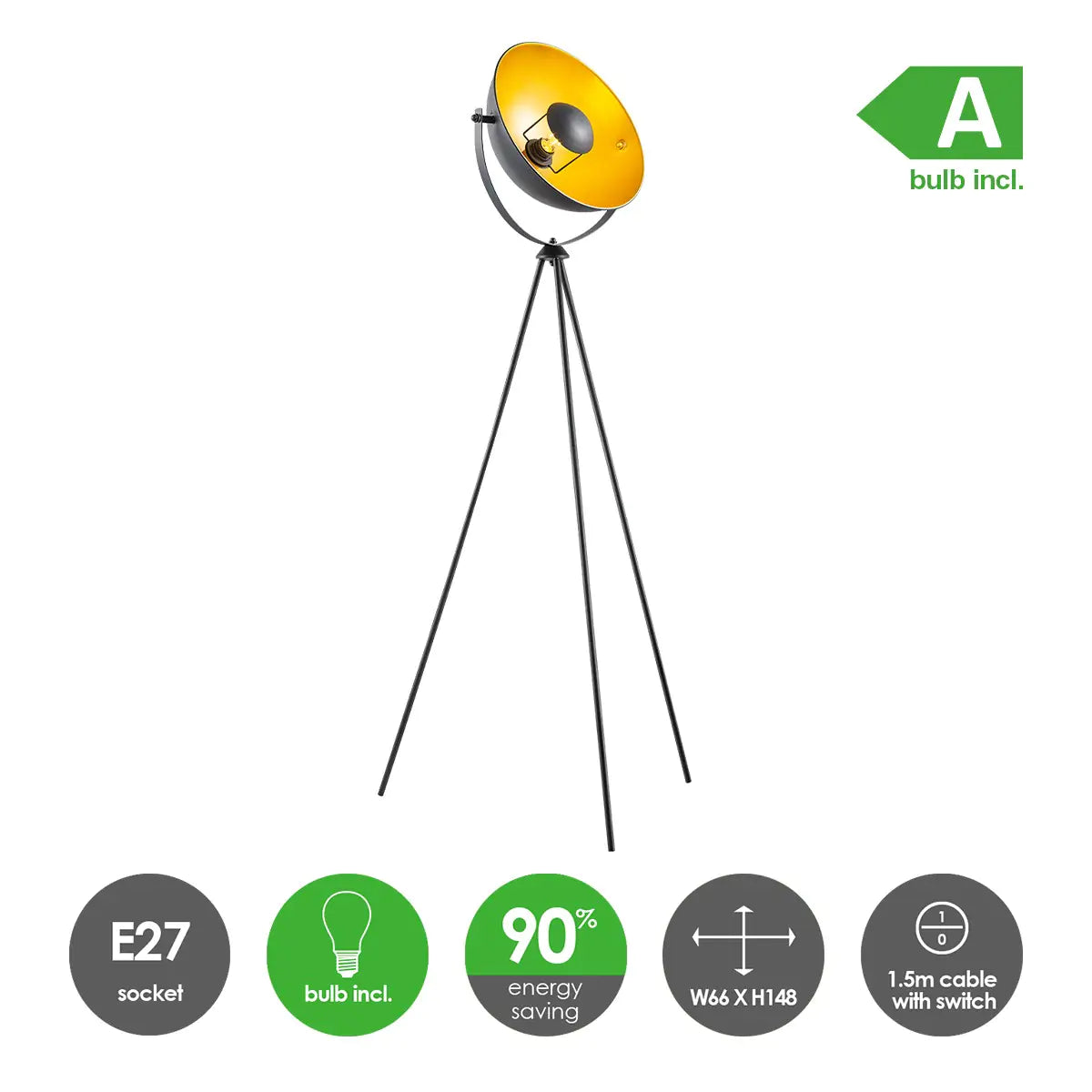 Deze klassieke vloerlamp meet 66cm (B) x 66cm (D) x 148cm (H). Hij heeft een stevige standaard van zwart metaal voor duurzaamheid. De vloerlamp wordt geleverd met een goud/zwarte metalen kap die gemakkelijk omhoog en omlaag te verstellen is voor gelijkmatig licht, waardoor hij ideaal is voor de woonkamer, slaapkamer of kantoor.