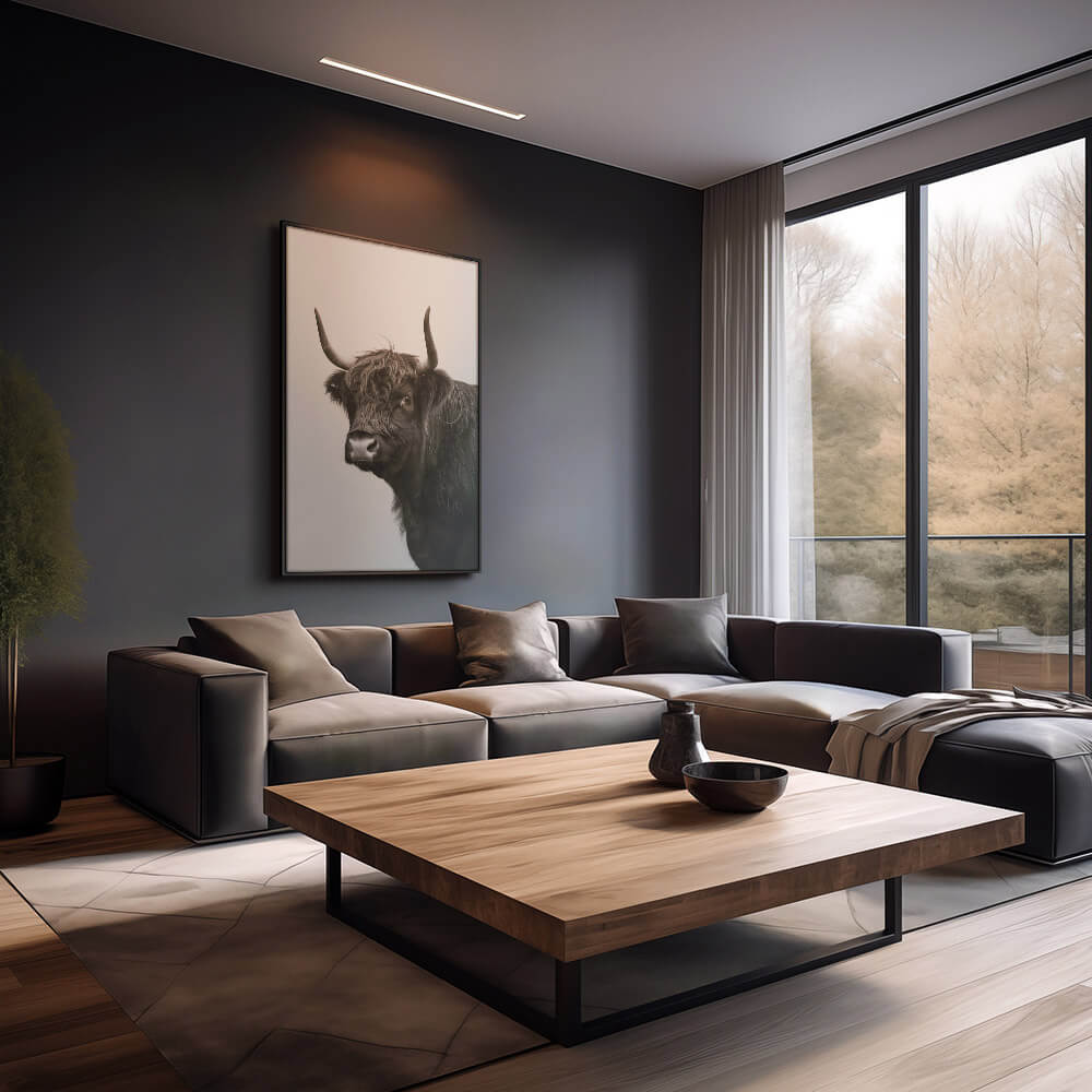 De krachtige uitstraling van “B&W Muscox II” brengt een tijdloze elegantie in elke ruimte. De monochrome tinten benadrukken de robuuste schoonheid van het dier. Een perfecte keuze voor een stijlvol en verfijnd interieur.